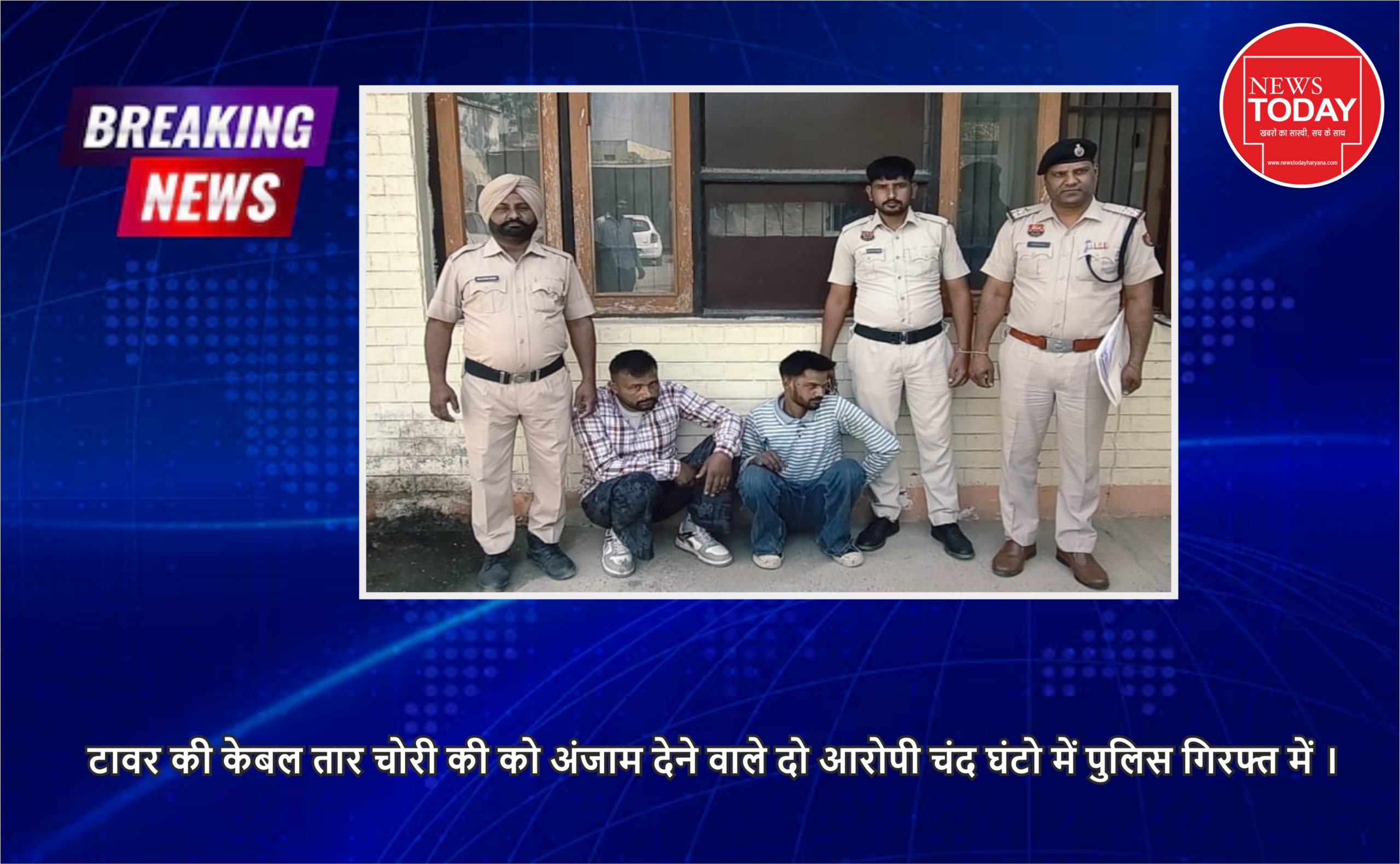 सिरसा-(अक्षित कम्बोज):- सिरसा पुलिस अधीक्षक दीपक सहारन के निर्देशानुसार सिरसा पुलिस द्वारा संपति विरुध अपराधियों के खिलाफ चलाए जा रहे विशेष अभियान के तहत जिला की रोङी थाना पुलिस ने महत्वपूर्ण सूचना के आधार पर कार्रवाई करते हुए गांव सुरतिया में लगे टावर की केबल तार चोरी की वारदात को अंजाम देने वाला दो युवकों को रोड़ी थाना पुलिस ने चंद ही घंटो में गिरफ्तार कर लिय है। इस संबंध में विस्तृत जानकारी देते हुए रोङी थाना प्रभारी ने बताया कि सिक्योरिटी सुपरवाइजर इंद्रदेव पुत्र मनीराम निवासी फरवाई कलां जिला सिरसा ने पुलिस को दी शिकायत में बताया कि बीती 22 अप्रैल की रात्रि को कुछ अज्ञात युवकों ने गांव सुरतिया मे लगे टावर की केबल तार चोरी कर मौका से फरार हो गए । रोङी थाना प्रभारी ने बताया कि पीड़ित व्यक्ति की शिकायत के आधार पर थाना रोङी में अज्ञात युवकों के खिलाफ चोरी का मामला दर्ज कर जांच शुरु की गई । जांच के दौरान रोङी थाना पुलिस ने महत्वपूर्ण सूचना के आधार पर कार्रवाई करते हुए चोरी की घटना में संलिप्त दो आरोपी हरजिंद्र सिंह उर्फ गुरी पुत्र जनता सिंह व गुरजीवन सिंह उर्फ अम्मा पुत्र काला सिंह निवासियांन बेहमान कुरसिंह वाला पंजाब को गांव रोङी क्षेत्र से गिरफ्तार कर लिया है । उन्होनें बताया कि गिरफ्तार किए गए आरोपियों की निशानदेही पर चोरीशुदा केबल की तार बरामद कर ली है । उन्होंने बताया कि गिरफ्तार किए गए आरोपियों को अदालत में पेश कर न्यायिक हिरासत में जेल भेजा जाएगा।। #Newstodayhry @Newstodayhry